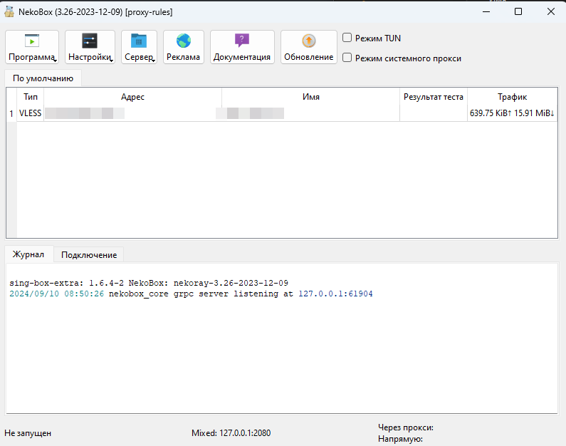 Π§ΡΠΎΠ±Ρ ΡΡΠ°ΡΠΈΠΊ ΡΠ΅Π» ΡΠ΅ΡΠ΅Π· NekoRay, Π΄ΠΎΠ»ΠΆΠ½Π° Π±ΡΡΡ ΡΡΡΠ°Π½ΠΎΠ²Π»Π΅Π½Π° Π³Π°Π»ΠΎΡΠΊΠ° Π Π΅ΠΆΠΈΠΌ TUN ΠΈΠ»ΠΈ Π Π΅ΠΆΠΈΠΌ ΡΠΈΡΡΠ΅ΠΌΠ½ΠΎΠ³ΠΎ ΠΏΡΠΎΠΊΡΠΈ (ΡΠ°Π·Π½ΠΈΡΡ ΡΠΌ. Π² ΡΠ°Π·Π΄Π΅Π»Π΅ Hiddify). ΠΡΠΈ ΠΎΡΠΊΠ»ΡΡΠ΅Π½ΠΈΠΈ ΠΏΡΠΎΡΠΈΠ»Ρ Π³Π°Π»ΠΎΡΠΊΡ Π½Π΅ΠΎΠ±Ρ ΠΎΠ΄ΠΈΠΌΠΎ ΡΠ±ΠΈΡΠ°ΡΡ, ΠΈΠ½Π°ΡΠ΅ ΠΈΠ½ΡΠ΅ΡΠ½Π΅Ρ-ΡΠΎΠ΅Π΄ΠΈΠ½Π΅Π½ΠΈΡ Π½Π΅ Π±ΡΠ΄Π΅Ρ. Π‘ΡΠΎΠΈΡ Π³Π°Π»ΠΎΡΠΊΠ° - ΡΡΠ°ΡΠΈΠΊ ΠΈΠ΄Π΅Ρ Π² NekoRay, Π½Π΅ ΡΡΠΎΠΈΡ β ΠΈΠ΄Π΅Ρ ΠΎΠ±ΡΡΠ½ΡΠΌ ΠΏΡΡΠ΅ΠΌ.